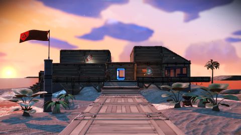 In the early days after the game's release, one player decided to walk all the way around a planet. The system where they did this was dubbed the Pilgrim Star, and a base was established there during the Foundation and Pathfinder eras. Captivated by the story of the Pilgrim's Path, I traveled there to see it for myself, and found no bases there since the 2018 NEXT update's universe reset. So I built the Visitor Center here, a minute's hike from the portal, with a monument to the Pilgrim to honor the place's history. And, of course, a gift shop. Portal Glyphs: Galactic Coordinates: 064A:0082:01B9:009A |